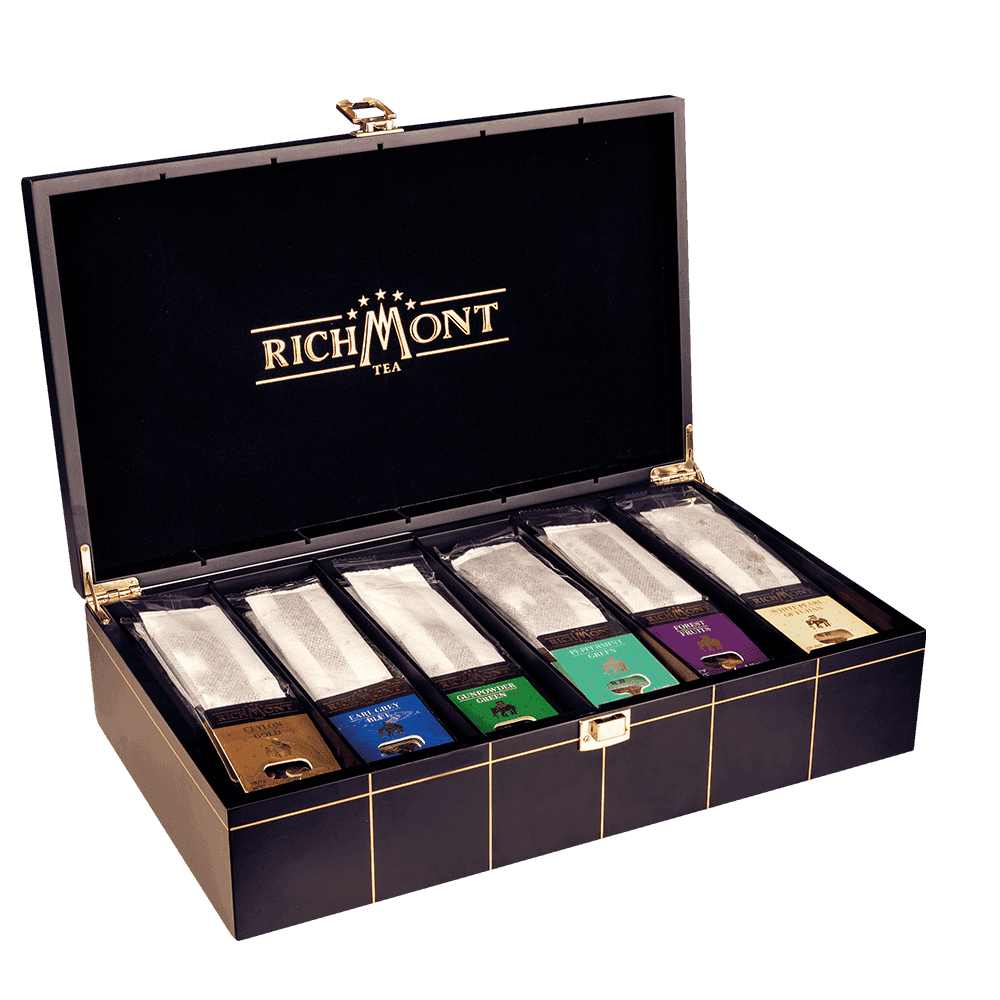 Drewniana skrzynka do prezentacji herbaty w eleganckiej restauracji, kawiarni lub biurze. W kolekcji jest sześć różnych smaków herbaty Richmont Excelence. Wykonana z naturalnego drewna skrzynka pozwala na prezentację herbaty przez obsługę. Nadaje się również na wytworny prezent lub jako wyposażenie eleganckiego biura bądź gabinetu.